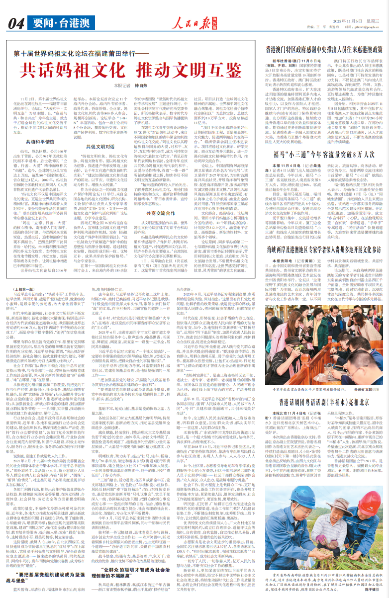 “妈祖文明有象、妈祖文化有脉、妈祖文物有形,要以妈祖文化为纽带,推进遗产传承发展迈上新台阶,让千年文化遗产焕发新时代光彩。”“建议加强妈祖文化相关遗产的联动,以节庆、非遗和文化活动为抓手,增强大众传播。” 作为分论坛之一的妈祖文化遗产保护利用论坛1日举行。来自全国各地的妈祖文化团体、研究机构、文物保护单位负责人及专家学者等,围绕“文物·文化·文明——妈祖文化遗产保护与活化利用”论坛主题,分享专业意见。 活动汇聚全国16家妈祖宫庙负责人,宣布建立妈祖文化遗产保护利用沟通协作机制,发布《妈祖文化遗产保护利用莆田倡议》。“这一机制致力于破解遗产保护中的信息壁垒与资源分散难题,通过制度化安排,推动形成目标一致、优势互补、成果共享的保护新格局。”与会专家表示。 在第十一届国际妈祖文化学术研讨会上,来自海内外的150余位专家学者围绕“数智时代的妈祖文化传承与发展”主题进行研讨。中国社会科学院古代史研究所党委书记、所长杨艳秋表示,数字时代为妈祖文化资源整合与国际传播提供了新机遇。 在妈祖文化青年交流论坛暨全球“Z世代”对话妈祖活动中,来自不同国家和地区的青年纵论如何推动妈祖文化交流。“妈祖文化以其跨越族群与国界的大爱,对和平、友好、互助精神的崇尚,成为可持续交流模式的最佳文化代言。”肯尼亚青年代表顾瑞秋倡议,全球青年应该共同弘扬妈祖文化所代表的和平、友爱与协作精神,沿着“一带一路”所铺就的相遇之桥,继续书写不同文明交流互鉴的新篇章。 “越来越多的年轻人开始关注、了解并喜欢上妈祖文化,用他们独特的视角和方式,重新诠释和传播妈祖精神。”莆田市委常委、宣传部部长陈惠黔说。