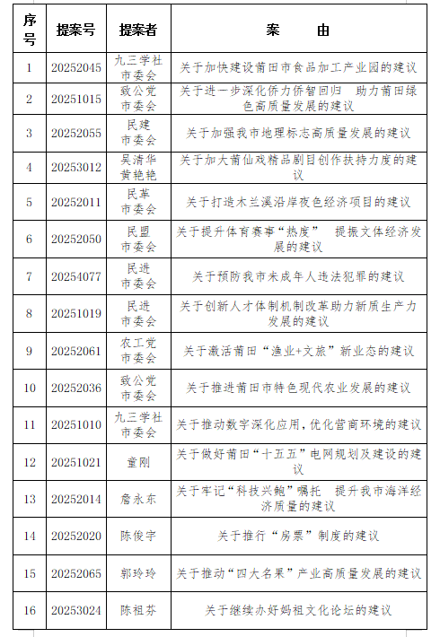 2025年以来,全市广大政协委员、政协各参加单位坚持以习近平新时代中国特色社会主义思想为指导,深入学习贯彻中共二十大及二十届历次全会精神,认真贯彻落实习近平总书记关于加强和改进人民政协工作的重要思想和对提案工作的重要指示精神,紧紧围绕市委“一五二三四”工作部署,聚焦莆田高质量发展首要任务,紧扣人民群众急难愁盼问题,以高度的政治责任感和历史使命感积极履职建言,形成了一批选题精准、调研深入、建议务实、成效明显的高质量提案,充分体现了新时代政协委员胸怀大局、心系民生的责任担当,展现了人民政协作为专门协商机构的独特优势。根据《中国人民政治协商会议莆田市委员会提案工作细则》相关规定,经八届市政协第五十一次主席会议研究,决定对《关于加快建设莆田市食品加工产业园的建议》等16件2025年度好提案予以通报表扬(名单附后)。希望受到表扬的提案者珍惜荣誉、再接再厉,以更高标准深耕调研、精准建言,持续深化提案培育,提出更多有前瞻性、针对性、可操作性的高质量提案。全市广大政协委员、政协各参加单位要以先进为榜样,聚焦“国之大者”、心系“民之关切”,切实把履职热情转化为履职实效,为奋力开创中国式现代化莆田实践新局面贡献政协智慧和力量。 |