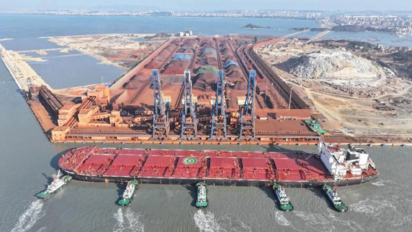 1月7日,罗屿港口迎来2026年第一艘40万吨级“海上巨无霸”——长362米、宽65米的“矿石香港”轮。(黄国民 摄)