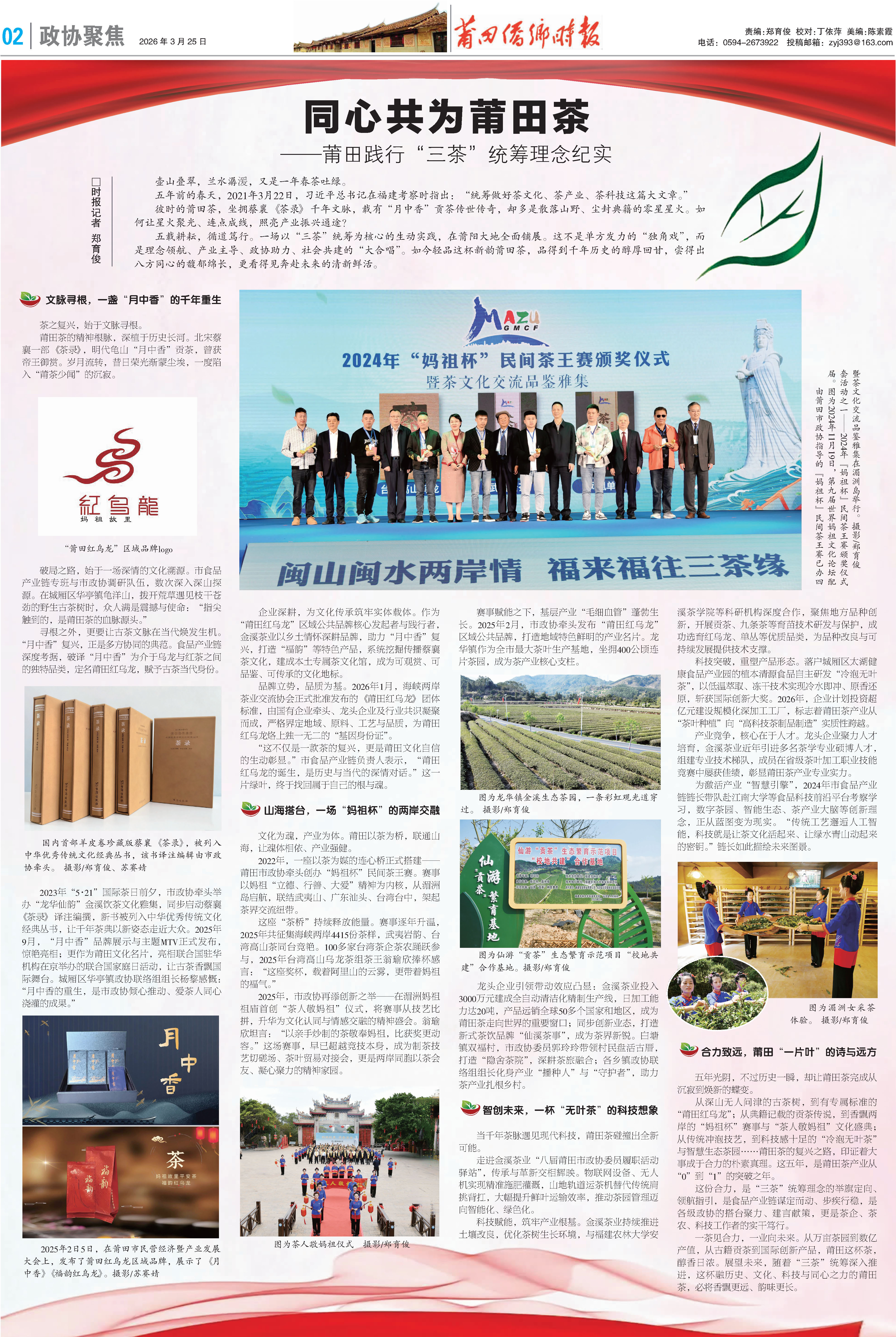 彼时的莆田茶,坐拥蔡襄《茶录》千年文脉,载有“月中香”贡茶传世传奇,却多是散落山野、尘封典籍的零星星火。如何让星火聚光、连点成线,照亮产业振兴通途? 五载耕耘,循道笃行。一场以“三茶”统筹为核心的生动实践,在莆阳大地全面铺展。这不是单方发力的“独角戏”,而是理念领航、产业主导、政协助力、社会共建的“大合唱”。如今轻品这杯新韵莆田茶,品得到千年历史的醇厚回甘,尝得出八方同心的馥郁绵长,更看得见奔赴未来的清新鲜活。