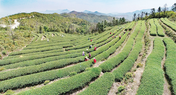 图为枫林村的郑宅茶茶园里茶农们正在采摘毛尖茶。 本报讯 茶山云雾绕,幽香沁人心。4月,几场春雨过后,又是一季采茶好时节,莆田市园庄…