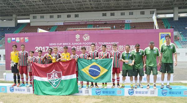 22日上午,2017金装国家少年足球邀请赛的最后一场比赛在体育中心举行,这也是U12年龄组的决赛,由巴西弗鲁米嫩赛足球俱乐部对阵杭州绿城育华足球队。比赛开场不到一分钟巴西队的前锋就打入一粒进球。在身高技法的绝对优势下开场十分钟就连进四球,打得杭州队有些措手不及。这时候台上的观众们也有些坐不住了,马上开始为杭州绿城育华足球队呐喊助威。然而受过专业训练、实力较强的巴西弗鲁米嫩赛足球俱乐部还是技胜一筹在开场的第十四分钟再进一球比分达到6:0。在第五十五分钟的时候由于杭州队的守门员有些分神,在对方进攻时球从他跨间穿过,巴西队再进一球。截至上半场休息,巴西弗鲁米嫩赛足球俱乐部领先杭州绿城育华足球队9分。下半场比赛在巴西弗鲁米嫩赛足球俱乐部潮水般的攻势中拉开,背水一战的杭州绿城育华足球队不仅要防守住攻势迅猛的巴西队还要寻找机会展开进攻。在短短五分钟内就多次阻断了巴西队的进攻。比赛剩下的十五分钟显得尤为关键。最后十五分钟,巴西队继续发挥传球、带球优势。因为双方实力悬殊,最后巴西弗鲁米嫩赛足球俱乐部以12:0的成绩赢得本场比赛夺得U12年龄组的冠军。同时在另一个半场的东莞麻涌对阵南非帕诺拉马争夺三、四名的比赛中以4比1的比分夺得第三名。