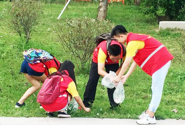 夏日炎炎,骄阳似火,志愿者们依旧干劲十足,拣拾烟头、纸屑、塑料瓶等垃圾杂物,他们一路前行,一路弯腰,不一会儿就装了几个大袋。虽然不少垃圾杂物深藏在草丛里,很难清理,但志愿者们依然秉持着不怕脏、不怕累的精神,互相合作力求把卫生死角清理干净。
