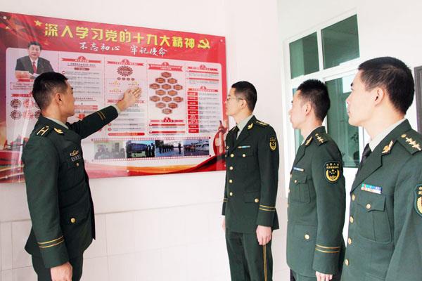 本报讯 “新时代党的强军思想,坚决贯彻执行军委主席负责制,坚定维护核心、坚决听党指挥,大力推进政治建军、改革强军、科技兴军、依法治军,切实履行好习主席和中央军委赋予的重大使命……”11月16日,东甲边防派出所教导员黄华杰组织官兵们集体学习,向大家认真讲解十九大精神知识。