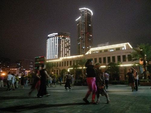 每当夜幕降临,市政南广场在五彩灯光的点缀下,显得更加璀璨迷人。欢快动感的音乐弥漫着夜幕下的市政南广场,踢踏、旋转、飞跳,神采奕奕的大妈大爷伴随着华灯踩出一曲曲自信与悠闲。黄大妈每天都会来这里跟大家一起跳广场舞:“以前这里很安静,没有几个人,现在灯亮了,景观灯很好看很漂亮,我们大家都很喜欢在这里锻炼。”