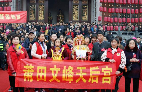 11月19日,由湄洲妈祖祖庙分灵的翡翠妈祖像,在莆田文峰宫妈祖神像众多妈祖信众的一路护送下,安座在江苏省昆山慧聚寺天后宫。