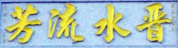 厅大门顶悬挂一方横匾,镏金的“王氏宗祠”四字格外耀眼,引人注目。大门两边安置一对明代雕刻的螺纹抱鼓石,下面配以含苞待放的花卉,整体显得古朴、大方。大门两旁悬挂“三槐家声大,汾山世泽长”的联板。上联“三槐”指北宋王祐的的故事。王祐(924-987),字景叔,有文名,历官中书舍人、史馆修撰、兵部侍郎。王祐曾在庭院亲植三槐,曰:“吾子孙必有三公者”。后其子旦果入朝为宰相,时称“王氏三槐”。下联“汾山”指东汾,即今东进村。东汾王氏亦有“王马家声大,汾山世泽长”、“槐树公卿种,梅花宰相诗”等姓联。东进村王姓村民收藏一通明代镌刻的“晋水流芳”石碑,弥足珍贵。现在王姓村民新建楼房大门石额上大都镌刻着“晋水流芳”四字(如图),以作姓氏标志。