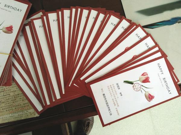生日会上惊喜连连:首先,大屏幕上播放出了一个个温馨的祝福视频:有来自母亲的,有来自学生的,有来自同事的,有来自家长的,还有来自朋友的……接着学校工会为各位“寿星”送上校长亲自为他们书写了充满祝福的贺卡。最后,每个“寿星”都收到了工会精心为她准备的生日“惊喜”之礼——蛋糕券。
