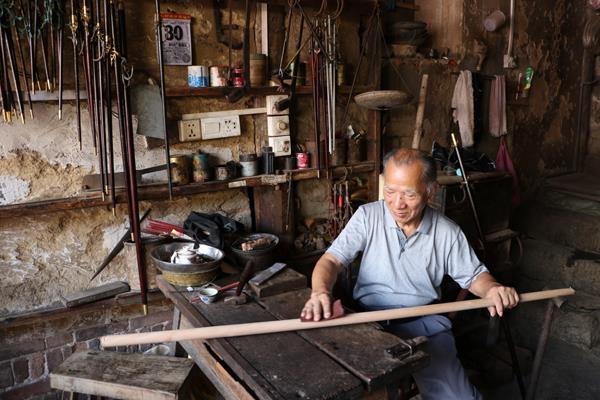 林加珍老人介绍,他15岁开始学艺,18岁开店,当时杆秤生意是鼎盛期,携带方便,容易辨识广受欢迎。他二儿子林碧青3岁时患双脚小儿麻痹症,但他身残志不残,18岁开始学制杆秤手艺,学成之后,林加珍将店内事务交给了他。林碧青接下介绍,他说,制作好杆秤不容易,木材选自油刺木,没有木结,无裂缝。制作核心在于精准,从选材到制作,先学“六花”,经过磨秤、称针、刻铜花、封铜,推磨、油漆等十几项工序,制一把小杆秤需要一天时间,大杆秤需二、三天。其中,成形后初磨的杆秤要找出重心,定下提纽的位置,这一工序需要长期经验的积累,没有长时间的磨炼无法快速准确地操作;再则,使用跨度不同的铁规在杆秤标注刻度位置,就非常考验制作者的专注力了;钻孔和钉星花,更是考验坚韧的耐心。全程工序做完之后,验秤这把杆秤是否合格,在售出之前再次验秤,林碧青制作的杆秤若换算成公制,误差在10克以内。