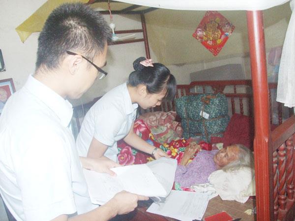 当天下午一回到建行,陈峻珩就为陈本办了一张崭新的建行卡,让人寿索赔款顺利汇入。此事在林桥村传开了,村民对建行人认真为民的工作精神纷纷点赞,表示今后要放心参加保险,更加相信建行。图为建行工作人员陈峻珩和朱群芳在林桥村陈本病床前询问现场一瞥。 (陈宝柱)
