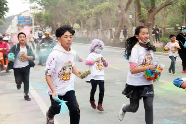 一路美景一路欢,健康快乐好人生。11月26日下午,第三届彩虹跑(健步行)在起点站妈祖祖庙圣旨门广场正式开跑,选手们沿着台湾风情街(朝宫街)、环岛东路、金海岸沙滩广场一路慢跑,全程3.23公里。一路上,选手们一边慢跑,一边互洒彩虹粉以示祝福,现场充满了活跃、欢乐的气氛。