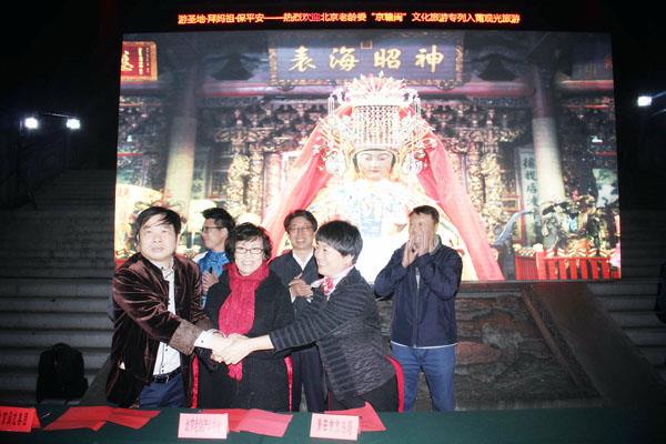 期间,市旅游局和北京市老龄产业协会、北京闽龙集团签订旅游合作协议,自愿结成旅游战略合作伙伴,共同致力推动“清新福建、妈祖圣地、美丽莆田”旅游品牌在京宣传促销,以加强城际交流互动,扩大在京市场占有份额,增长入莆游客数量,增加莆田旅游收入。协议指出,今后一段时期,莆田旅游要加大在京宣传品投放力度,拓展旅游营销市场,共享旅游信息对接供需终端,在旅游客源、资讯、投资等方面实现引京入莆,提升莆田旅游发展质量和效益。同时做好地接服务和协调工作,并对来莆的京旅专列(专机)旅游团队在景区门票、星级酒店、旅行社等方面给予一定的优惠和奖励措施。莆田市旅游局林桦局长说,清新福建、妈祖圣地、美丽莆田欢迎闽龙号旅游专列入莆,也欢迎远道而来的北京旅行商、游客。在莆期间,大家可以瞻仰妈祖风采,鉴赏莆仙戏,品尝莆仙小吃,玩购仙作工艺品,也可以发表对莆田旅游的意见建议。祈愿妈祖保佑大家平安健康、旅行顺利,也祝愿京莆两地旅游合作从此揭开新的篇章。