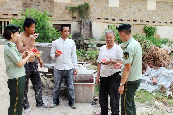 本报讯 日前,东庄边防派出所开展“送清凉下乡”活动,组织官兵赴辖区,为辛勤劳作于一线的工人群众送去解暑饮品。期间,该所官兵为辖区农民工送去一罐罐冰凉的饮品,一块块冰凉的西瓜,送去的是东庄边防派出所官兵对辖区工人的一片赤诚。同时,为农民工讲解降温方法、预防常识和中暑急救措施等知识,为坚守在一线工地的农民工送去夏日的丝丝清凉。 (林志超 詹海燕)