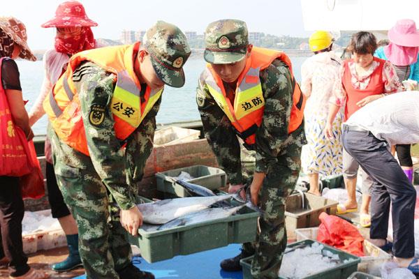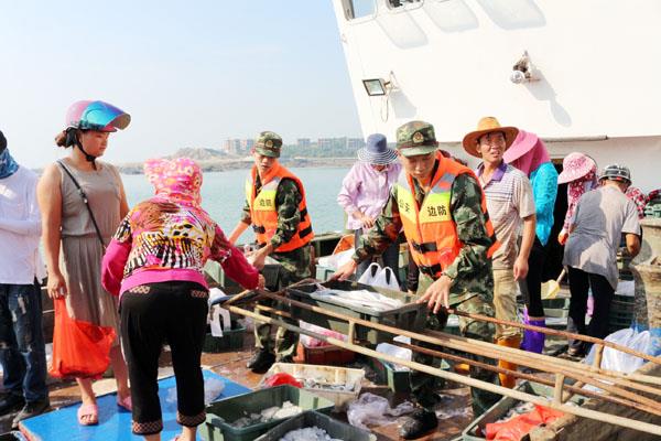 在一艘满载的渔船上,一个个储鱼箱里装满了带鱼、鲳鱼和马鲛鱼。渔船刚靠上岸,莆田市边防支队船艇大队的官兵们就和船上的渔民一起,忙着将装好的鱼筐卸到岸上。码头上也是人来人往。为了抢购到新鲜的渔货,一些市民和鱼贩已早早守候在码头。一时间,渔民、商人的吆喝声不绝于耳,传递着大海恩泽的喜悦。(时报记者林锦堂 通讯员 田树伟)