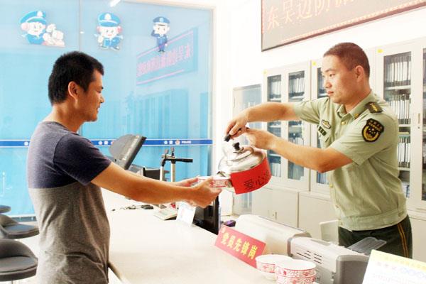 本报讯 日前,东吴边防派出所积极开展“为群众送清凉”活动。期间,该所在警务服务大厅设立了“爱心休息点”,每天上下午均免费为前来办事的群众提供凉茶、绿豆汤、清凉油等防暑降温用品。此外,该所还组织民警深入田间工地,为在农间耕地的农民、工地打工的员工等送上“爱心凉茶”,详细向群众讲解防暑降温和中暑急救措施等知识,向为坚守在一线的劳动人员送去“丝丝清凉”。 (蔡伟锦堂)