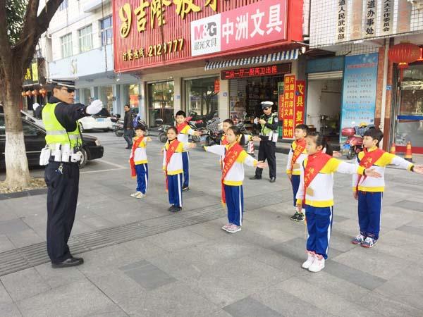 体验课上,黄警官教会孩子们认识交警指挥手势,了解遇到不文明行为的劝导方式,也掌握了如何的确保自已安全的同时又能帮助他人的要领。
