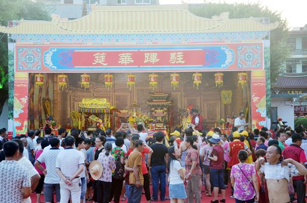 10月1日上午,秋高气爽,晴空万里。8点18分,参加巡安的两岸妈祖从萩芦灵慈宫起驾,当日中午驻驾延宁宫,当晚驻跸福莆仙东岳观,并举行隆重的驻跸庆典活动,其中就有精彩绝伦的省级“非遗”文化项目——“抛铁球”展演;10月2日,两岸妈祖驻驾新县文峰宫,当日傍晚回銮安座。