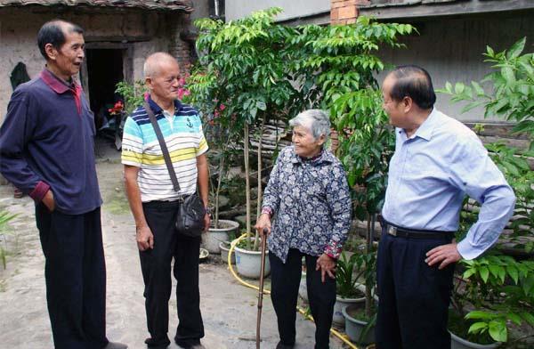 10月8日,原莆田市公安局退休的王开同(右)携同原中国银行退休的范玉麟(左二)两位老同志,特地前往莆田山区大洋镇大洋村看望困难老战友,送去节日的问候和温暖。图为87岁的老妪在向儿子的老战友介绍自己的健康状况。(子木)