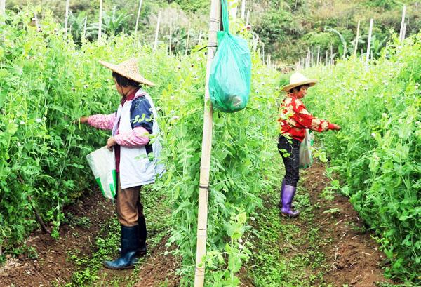 在大济镇三会村一片碗豆田里人头攒动,许多农民在采收碗豆、花菜,该村承包地种植的蔬菜今年喜获丰收。
