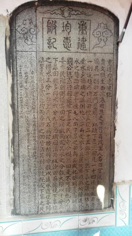 1.遗刻为《重建均惠陂记》,该石刻碑记现嵌于村内灵应社墙壁上,石碑底部文字疑嵌入墙内,左侧文字亦毁损。《未轩文集》亦记载该碑记。 <《未轩文集》所载与石刻文字有异。下文以【】标识石碑上已失文字。对异字,文集以 □ 标出,石刻在()注明。>