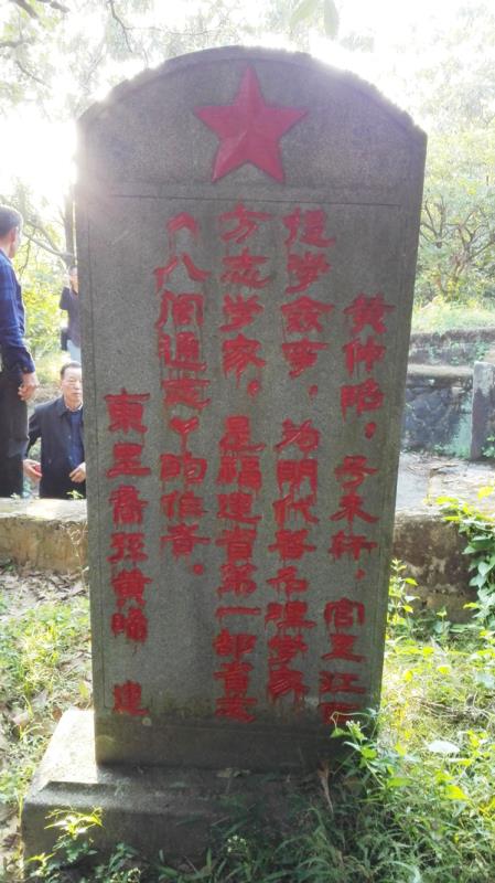 二、云峰村黄仲昭墓。墓在今莆田县华亭镇云峰村,保存完好。有墓碣刻“皇明理学名臣未轩黄先生佳城”。外观呈“风”字形,石、三合土结构。墓埕右侧立石,正面刻“黄仲昭墓 现予公布为我县第三批重点文物保护单位 公元一九八四年八月 立石”,“我县”,指莆田县。背面刻“黄仲昭,字未轩,官至江西提学佥事,为明代著名理学家、方志学家,是福建省第一部省志《八闽通志》的作者。 东里裔孙黄晞 建”。