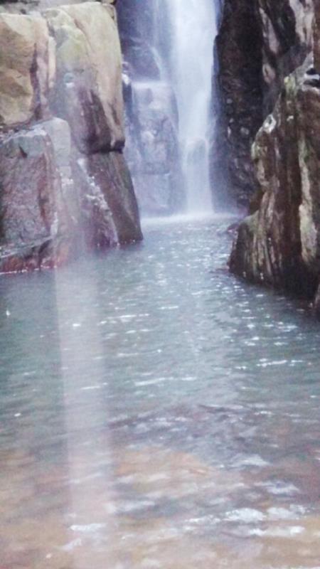 在我等使劲攀爬如同“天梯”山涧路中,路回路转,“到了到了,哗哗,听到了”。未见其瀑先闻其声。老远,我们就闻见有点惊天动地的咆哮声,一下子触动了疲劳的神经,兴奋起来。在一片带有原始神秘色彩的山崖上悬挂着一匹银白色的小飞瀑,争先恐后地直奔可谓“碧玉潭”的潭底,这股小瀑布似白练洁美,可喷珠吐玉,气势非凡,发出的声音也可是震耳欲聋的了。但见那率性而流的小瀑布在嶙峋的山石上欢畅飞溅的水珠,总是那么清澈、透亮,溅起的浪花晶莹剔透,就像跳动着赞美生命的音符。