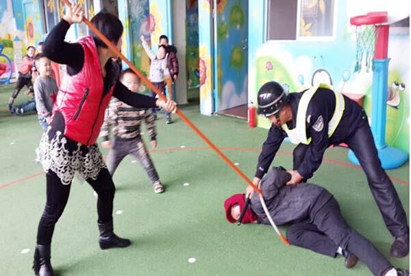 此次安全演练在全体幼儿和教职工中展开的。现场假设“歹徒”以家长身份混入幼儿园。老师和保育员临危不乱,与“歹徒”交涉、周旋,设法牵制“歹徒”,竭力保护幼儿安全。班级教师则按照平时各种安全会议中的安全防范,采取有针对性防暴力事件的各种措施,在最短的时间内疏散幼儿、帮助幼儿逃离到就近安全、隐蔽的地方,迅速拨打“110”报警。最后“歹徒”在教师及保安人员的齐心协力下被成功制伏。演练后班级教师在安抚幼儿情绪的同时,对幼儿进行了安全教育。