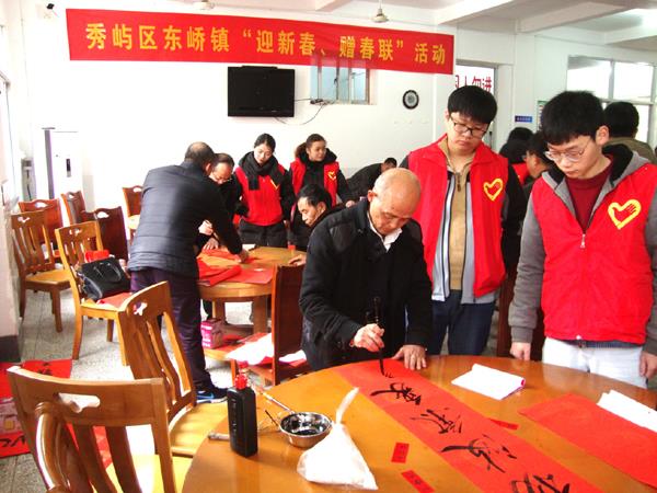 日前,秀屿区东峤镇在机关礼堂里举行“迎新春 赠春联”活动,为群众义务书写春联,倡导移风易俗过年。