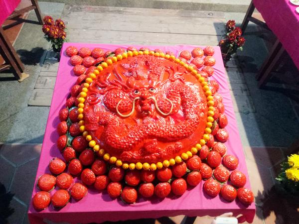 红团,是莆田的特色小吃,寓意红红火火,团团圆圆。这个“大红团”寓意国泰民安,子民幸福。中间一条红色巨龙,寓意中华民族是龙的传人;旁边围绕着56个小红团,象征中国五十六个民族大团结;巨龙边缘还添上一圈小福桔,更为精致美观。龙头、龙眼、龙须、龙身、龙爪、龙鳞,每一个细节都精雕细琢。