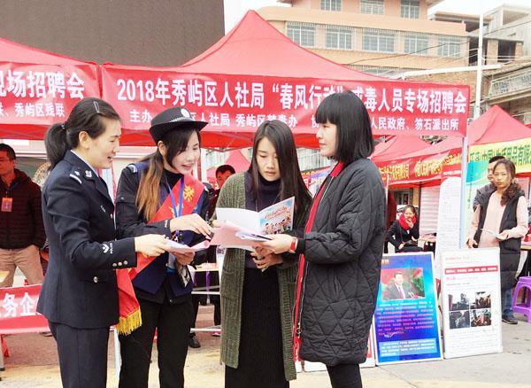 为了在新的一年中切实帮助戒毒康复人员解决生活和就业中的困难,加强社区戒毒人员与用人单位的沟通交流,更好地为用人单位与戒毒人员搭建双向选择的平台。2月27日上午,秀屿区禁毒办联合秀屿区人社局在笏石镇北埔村西天尾召开“春风行动”社区戒毒人员专场招聘会。