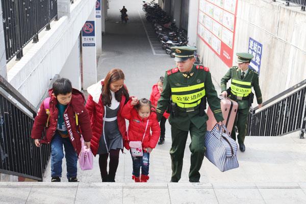 春运期间,边防执勤民警积极联合动车站开展“党员先锋服务队”便民服务活动,为广大旅客提供优质服务,扶老携幼,搬运行李,提供旅行咨询等活动,每天坚持为旅客做着一件件小事,以实际的行动践行着全心全意为人民服务的根本宗旨。