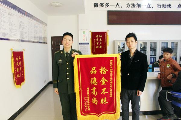 春节期间“加班”的便民举措还让东甲边防派出所户籍室意外收获了一面红艳艳的锦旗。正月初六下午,宋超群打扫人像采集室卫生时,在角落发现一个黑色长方体男式钱包,内有大量现金和银行卡等贵重物品。想到失主肯定很着急,为了尽快将失物归还,他顾不上吃饭,立刻通过翻查视频监控录像和查询业务系统记录,确认钱包是辖区群众徐先生在办理户籍业务时遗落的。随后,宋超群通过电话通知徐先生前来认领,在核实身份无误后,将钱包交还给了他。次日,为表达对该所民警为民解忧、急群众之所急的工作作风的肯定,徐先生来到派出所,满怀感激地将一面写着“拾金不昧 品德高尚”的锦旗交到民警手中。