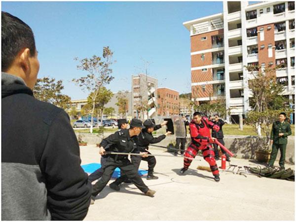最后,学校保安及相关工作人员也在大队的官兵的指导下,拿起防暴器械,实际演练了防御、进攻的套路、方法。