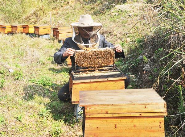 陈师傅取来护蜂面网(罩)戴上,然后向场地的蜂箱走去,半蹲轻轻拿掉压在蜂箱顶部的保护木板,慢慢地把铺在下面的夹层揭开,小心翼翼地取出一张布满一个个六角形蜂房的巢脾,上面爬满了蜜蜂。凑近瞧了瞧,陈师傅说,一个蜂箱内,一般有2、3万只蜜蜂,他用手指着一只体型较大的蜜蜂说;“看,这个就是蜂王,也叫蜂后,它是一群蜂的首领,是雌蜂,专门负责产卵。”笔者靠近看到这成千上万只蜜蜂,心里总是有点发怵,始终没敢靠前一步。陈师傅说“没事的,只要你不侵犯它,它是不会无故蜇人的,顶多爬一小会儿就飞走了”。笔者这才壮起胆子往蜂箱旁靠近,现场跟着陈师傅学起了养蜂知识。陈师傅小心谨慎地翻转着沾满蜂蜜的巢脾,介绍着蜂箱内的结构,还有那些蜂王、工蜂、雄蜂的分工和形成以及巢脾上蜜蜂的繁殖率、采蜜率,或是否染上病虫害等技术。
