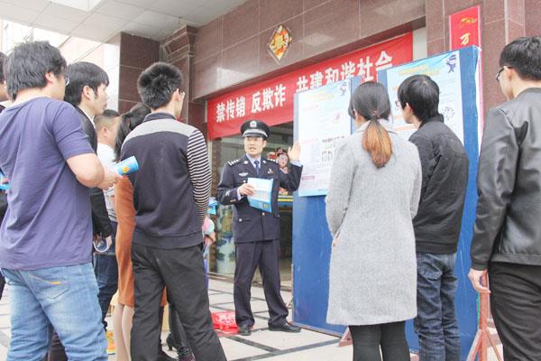 日前,秀屿公安分局经侦大队组织民警走进笏石“莆田市辉弘鞋业有限公司”,开展以“禁传销、反欺诈,共建和谐社会”为主题的宣传活动。宣传现场,民警通过设立临时咨询台、悬挂宣传横幅、摆放展板、宣传画报以及发放打击传销宣传手册等方式,向企业员工揭露传销违法犯罪活动的危害性,面对面宣讲打击传销违法犯罪行为的目的意义,教育他们自觉远离传销、抵制传销。(周金赞陈天龙)