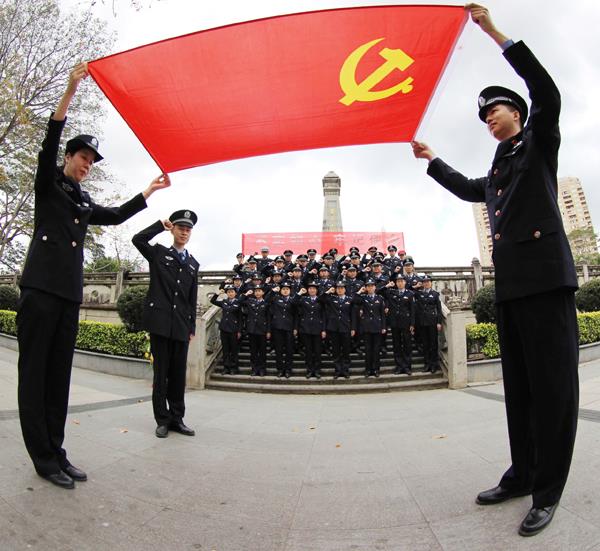 本报讯 为深切缅怀革命先烈及公安英烈。清明节前夕,涵江公安分局50多名青年民警来到闽中革命烈士陵园开展“弘扬英烈精神、做党的忠诚卫士”活动。在烈士陵园,全体民警向烈士纪念碑敬献花篮,脱帽默哀3分钟,并向革命先烈们及公安英烈们三鞠躬,接着,青年民警逐一将鲜花放到碑前,表达对英烈的思念及敬意。随后,青年党员民警在纪念碑前重温入党誓词。图一为青年党员民警在纪念碑前重温入党誓词。图二为分局青年民警怀着崇敬的心情,带着深切的思念来到闽中革命烈士陵园开展“弘扬英烈精神、做党的忠诚卫士”活动。 (梁东红)