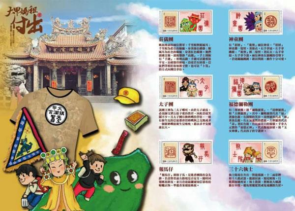 为了迎接2018大甲妈祖国际观光文化节,台湾台中邮局制作发行个性化邮票小版张、纪念封等一系列妈祖系列邮品,助力这一盛会。邮票小版张包含6枚个性化邮票,分别是状仪团、神童团、太子团、福德弥勒团、报马仔、三十六执士等卡通图案和相关介绍文字,令人爱不释手。纪念封1套2枚,分别为起驾、回銮,是台中邮局作为赠品派发,同时启用同题纪念邮戳。