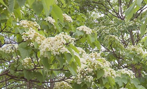 “怪来春晚寒如许,无赖桐花领取来”。油桐树是大蜚山上常见的乔木,它的繁殖能力很强,多以集体式生长将片片山头簇拥成一片海洋。据介绍,四月下旬以来,由于今春平均温度较高,该公园里一棵棵躯干粗糙,枝丫瘦弱的油桐树花期提早来临,野生或种植的油桐树相继开花,花团锦簇,初夏白花如雪,一阵清风拂来或一场春雨飘落,就宛如天降雪花一般,因此被誉为浪漫迷人的“五月雪”。目前,大蜚山景区内遍布有油桐树上万棵,花开正盛,洁白的花瓣或挂在树上,或片片娇俏花朵在风雨中淫淫随风飘落,花枝颤动,落英缤纷,犹如雪上飞花,绵延成一片香雪海,别有一番诗情画意的景致。