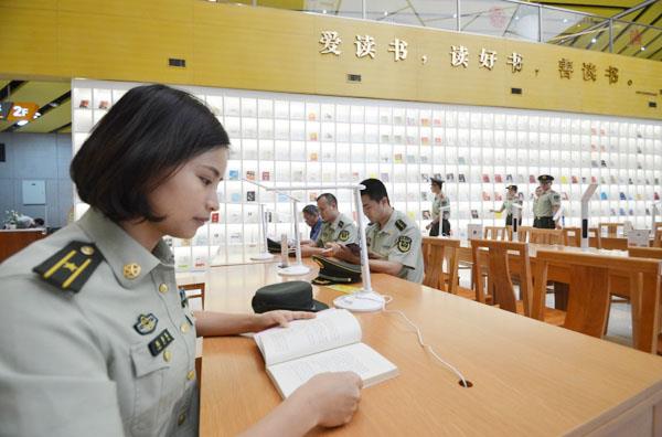 本报讯 部队改革期间,莆田边防检查站开展“悦读阅美,改革扬帆”主题读书日活动,倡导官兵培养积极健康的生活情趣,因情施策做活官兵思想主阵地。图为5月10日下午,该站女警正在驻地市图书馆阅览。 (吴志 黄晓军 育俊)