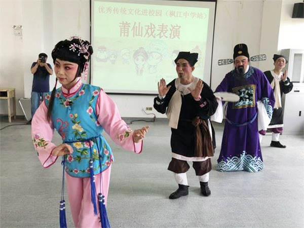 “戏剧又进校啦!”5月31日,仙游县鲤声剧团走进枫江中学,带来了经典折子戏《春草闯堂》和新编廉政小戏《扶贫风波》。在小礼堂的简陋舞台上,生旦净末丑等演员们粉墨登场,倾情演绎表演才华,他们还有板有眼地为学生们讲授戏剧理论,现场展示精美服饰、古典化妆、婉转唱腔和优美舞功,并做了问答式的互动交流及现场点拨学习模仿秀,赢得师生经久不息的掌声,让零距离接触莆仙戏的同学们感受到传统戏曲的无穷魅力,呈现出一个“学莆仙戏、唱莆仙戏”的良好氛围(如图)。对此,仙游鲤声剧团团长郑新光高兴地说,“国家非物质文化遗产的莆仙戏,如今是莆田地方民俗文化的主要内容之一。鲤声剧团的演员们都很高兴能来到枫亭镇为戏剧进校从小抓起,给农村学校的孩子们讲授莆仙戏戏剧理论、展示莆仙戏基本动作,希望莆仙戏这个古老戏种能代代相传,更好地传承莆仙戏美好的艺术魅力。”