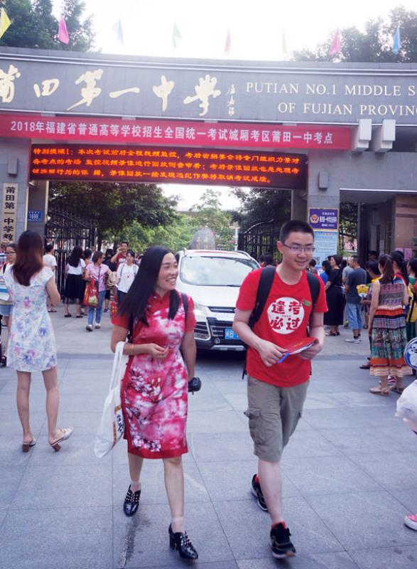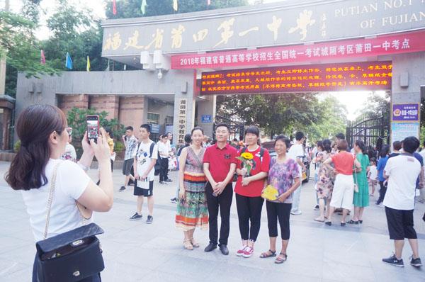 在莆田一中,走出考场的考生和家长纷纷在门前合影留念,记录下这人生中非常重要的时刻。