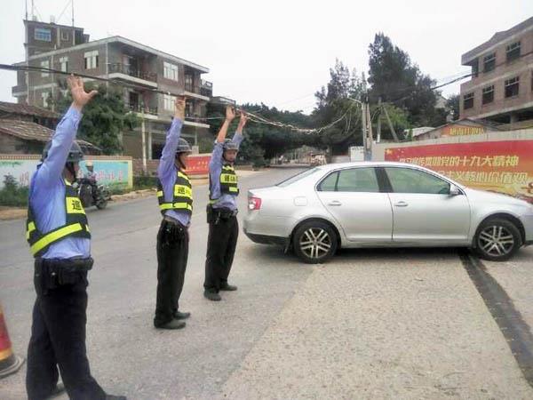 南山网格负责人立即赶到现场,进行实地查看,发现挂着移动光纤的钢丝离地面约80-90公分,这个高度连骑麾托车也只有低着头才能通过,若没注意安全,钢丝会挂到脖子,十分危险,其它高一些的车辆根本无法通过。于是便立即上报巡逻队长许栋,队长要求巡逻队员暂停巡逻,就在路口引导、帮助过往车辆通过,等待移动人员前来抢修。在等待移动抢修人员的过程中,现场的网格巡逻队员时而用手举着钢丝让摩托车通过,时而用木棍顶着让轿车或农用车通过,遇到货车和校车较高的车辆便用借来的梯子顶着让其通过。三个小时后,移动抢修人员赶到路口,并立即处理了下垂的移动光纤钢丝,看到路口己清理完毕,恢复正常后,南山网格巡逻巡查员才放心离去。