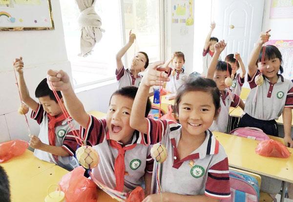图为荔城区北高中心小学的孩子们从家里带来了自己参与制作的、用五彩蛋兜装着的端午蛋来到学习与朋友们一起分享。(李霞)