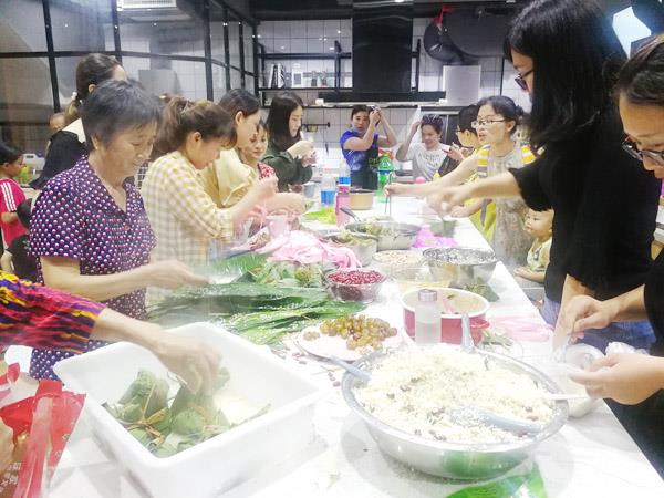 整洁大气的厨房里,先进的燃气灶、大冰箱、锅碗瓢盆、各种调味料应有尽有。厨房中间一张近2米多长的料理台上已经摆满泡过的糯米、红豆、花生米、熟咸鸭蛋蛋黄、红烧肉……近日,宝妈燕燕和“鱼丸哥”带着食材在厨房里摆开架势,迎接好朋友的到来。“早在一周前我们就在群里接龙报名一起过端午,两天时间里就有30多位宝妈朋友响应,这样另类的过传统方式很受大家欢迎。”群主蔡燕燕也是一位孩子刚10个月的宝妈,她想到,现在很多年轻妈妈都不会包粽子,如果是一群年纪相仿的宝妈朋友在一起玩,会不会很有意思?当她把想法组织成“浓情端午 共享粽叶香”的活动在群里和大家一探讨,就得到积极响应。