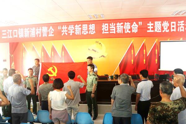 本报讯 7月1日,三江口边防派出所联合三江口镇新浦村党支部、驻地企业党组织开展“共学新思想 担当新使命”主题党日活动。面对鲜红党旗,重温了入党誓词,并围绕“入党初心是什么”“如何更好地履职奉献”等主题展开交流讨论,说心得、谈感想、表决心争取辖区群众和党政机关、企事业单位等社会力量对警民融合工作的理解、支持,在革命精神洗礼中共同激发献身使命和爱党爱国的革命热情。(吴思奇)