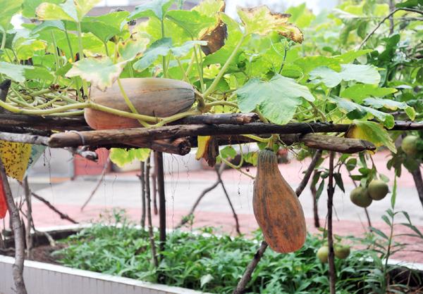 今年春季,她在自家院子的花坛里栽了丝瓜、空心菜、苋菜、玉米、南瓜,瓜棚架上结满了南瓜和各种四季菜,这个时候是瓜果收成的季节,他的田里及家中院子里瓜棚上挂满了南瓜,棚架上瓜藤开花不断,至目前南瓜已采收40多个,比起栽花,她觉得种瓜果蔬菜更得收获不同季节的健康与美景。