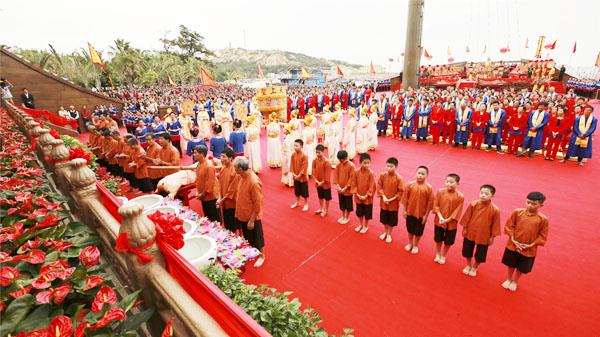 海祭妈祖是人类非物质文化遗产“妈祖信俗”重要组成部分,并在湄洲岛代代传承。按照惯例,古时渔民出海时,都要在船上摆供品,渔民家属则在海边摆供品对海举行祭祀仪式,祈求风调雨顺、平安丰收。今年台湾30多家宫庙和大陆20多家宫庙联袂海祭妈祖,在海祭大典中融入包括渔民上供、舞生跳八佾舞、渔民放生、渔船燃鞭庆贺等民俗文化,进一步凸显两岸同胞血浓于水,也让海内外的妈祖信众感受到民俗文化的独特魅力。