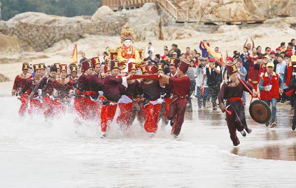 在今年妈祖羽化升天1031周年纪念日活动现场,来自宁德霞浦竹江前奥天后宫的120多名妈祖信众在湄洲岛海滩现场表演“阿婆走水”,吸引了众多观众。
