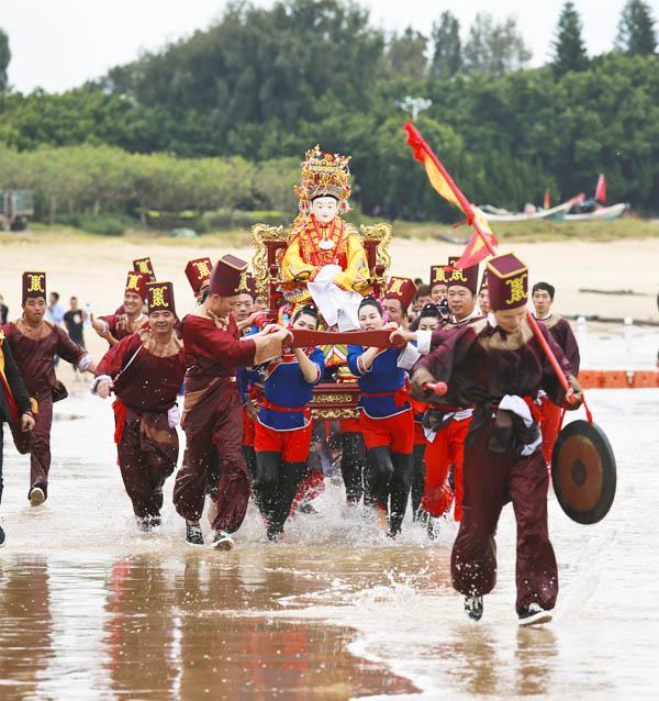 据介绍,“阿婆走水”也被称作“妈祖走水”,但见乡民们扶妈祖神像正襟危坐于轿上,选精壮数十人在潮水刚涨时抬到海滨,当潮水涨到脚踝高,二十多名壮汉抬着两顶妈祖神像的轿子,在敲锣手的引导下,冲向预定海域,溅起层层浪花。轿手们在海上奔跑出100多米后,停下,将轿子抬高、放下,反复沾水36次,以此祈求平安与丰收。