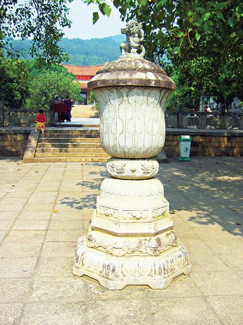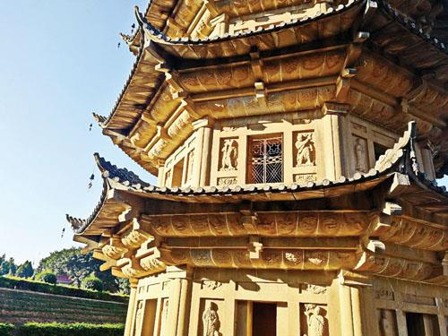 三摩地前方的日光、月光菩萨塔,上部四向各有一尊洞窟坐佛,最上端为菩萨头像。中间七层圆柱相连,四角有山花蕉叶饰刻,雕刻精美。佛肠坑北侧水池有一尊白石雕观音立像,华美精致,优雅飘逸。